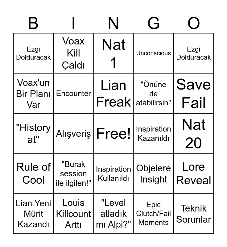This bingo card has a free space and 24 words: "Burak session ile ilgilen!", Louis Killcount Arttı, Lian Freak, Lian Yeni Mürit Kazandı, Ezgi Dolduracak, Ezgi Dolduracak, Voax'un Bir Planı Var, Voax Kill Çaldı, Inspiration Kazanıldı, Inspiration Kullanıldı, "Önüne de atabilirsin", "History at", Objelere Insight, Lore Reveal, Encounter, Epic Clutch/Fail Moments, Nat 20, Nat 1, Save Fail, Alışveriş, Teknik Sorunlar, Rule of Cool, Unconscious and "Level atladık mı Alpi?".