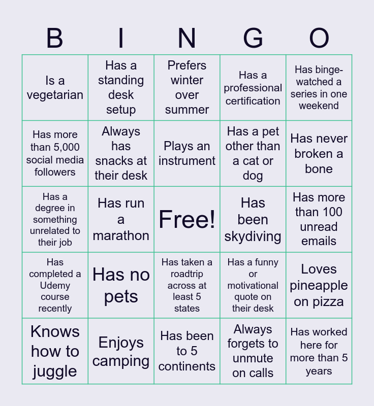 This bingo card has a free space and 25 words: Has no pets, Has been to 5 continents, Plays an instrument, Knows how to juggle, Has binge-watched a series in one weekend, Is a vegetarian, Has more than 5,000 social media followers, Has a standing desk setup, Has been skydiving, Has taken a roadtrip across at least 5 states, Has a pet other than a cat or dog, Has a degree in something unrelated to their job, Has a funny or motivational quote on their desk, Loves pineapple on pizza, Always has snacks at their desk, Uses dark mode for everything, Has more than 100 unread emails, Prefers winter over summer, Has never broken a bone, Has run a marathon, Has worked here for more than 5 years, Enjoys camping, Has completed a Udemy course recently, Has a professional certification and Always forgets to unmute on calls.