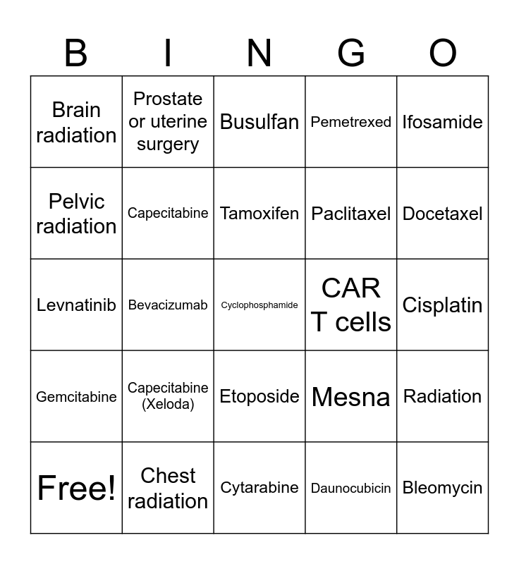 This bingo card has 29 words: Free!, 5FU, Bevacizumab, Bleomycin, Brain radiation, Busulfan, Capecitabine, Capecitabine (Xeloda), CAR T cells, Chest radiation, Cisplatin, Cyclophosphamide, Cytarabine, Daunocubicin, Docetaxel, Doxorubicin, Etoposide, Gemcitabine, Ifosamide, Levnatinib, Mesna, Methotrexate, Paclitaxel, Pelvic radiation, Pemetrexed, Prostate or uterine surgery, Radiation, Tamoxifen and Vincristine.