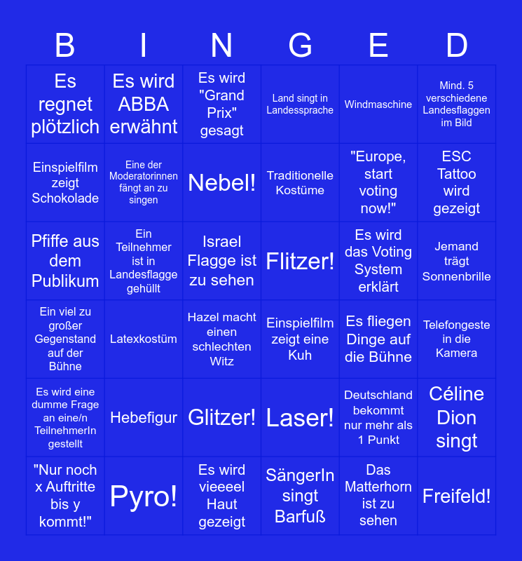 This bingo card has 60 words: Nachbarn geben einander 12 Punkte, Einspielfilm zeigt eine Kuh, Es wird in mehr als 1 Sprache gesungen, Flitzer!, Telefongeste in die Kamera, Konfetti, Einspielfilm zeigt Schokolade, Es wird geweint, Nebel!, Es wird in den Greenroom geschaltet, Land singt in Landessprache, Jemand trägt eine Maske, Mind. 5 verschiedene Landesflaggen im Bild, "Nur noch x Auftritte bis y kommt!", 5 oder mehr Tänzer auf der Bühne, Es regnet plötzlich, Pfiffe aus dem Publikum, Windmaschine, 2 Menschen küssen sich, Eine der Moderatorinnen fängt an zu singen, Ein Teilnehmer ist in Landesflagge gehüllt, Es wird "Grand Prix" gesagt, Hazel macht einen schlechten Witz, Latexkostüm, Es wird der letztjährige Sieger erwähnt, Pyro!, Deutschland bekommt nur mehr als 1 Punkt, Bei der Punktevergabe wird Deutsch gesprochen, Traditionelle Kostüme, SängerIn singt Barfuß, Es wird auf die Technik der Bühne eingegangen, Outfitwechsel auf der Bühne, Die Kamera steht auf dem Kopf, Es wird an Sandra Studers ESC Auftritt erinnert, Es wird ABBA erwähnt, Hebefigur, Jemand trägt einen Hut, ESC Tattoo wird gezeigt, Es wird vieeeel Haut gezeigt, "Europe, start voting now!", "Every vote counts", Es wird das Voting System erklärt, Israel Flagge ist zu sehen, Essen auf der Bühne, Ein viel zu großer Gegenstand auf der Bühne, Laser!, Ganzes Gesicht als Landesflagge, Teilnehmer zeigt ein Herz mit den Händen, Teilnehmer ist alleine auf der Bühne, Jemand trägt Sonnenbrille, Es fliegen Dinge auf die Bühne, Teilnehmer hängt an Seil von der Decke, Freifeld!, Glitzer!, Céline Dion singt, Das Matterhorn ist zu sehen, "Good evening Europe, good morning Australia!", Das Wahrzeichen des Landes ist bei der Punktevergabe zu sehen, Es wird eine dumme Frage an eine/n TeilnehmerIn gestellt and "Wie nennt ihr / heißt das in eurer Sprache?".