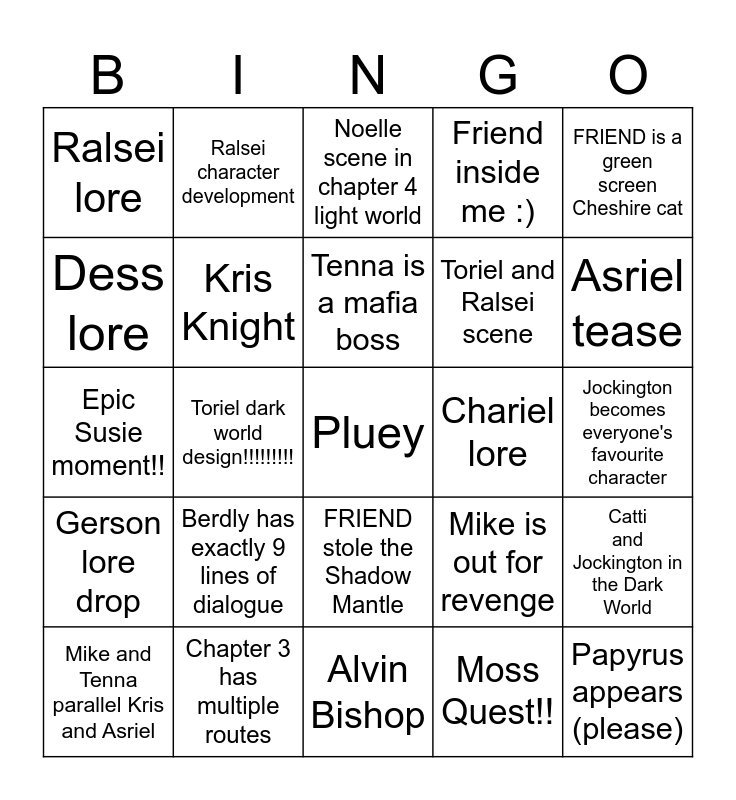 This bingo card has a free space and 24 words: Berdly has exactly 9 lines of dialogue, Chapter 3 has multiple routes, Tenna is a mafia boss, Mike and Tenna parallel Kris and Asriel, FRIEND is a green screen Cheshire cat, Ralsei lore, Dess lore, Ralsei character development, Chariel lore, FRIEND stole the Shadow Mantle, Toriel and Ralsei scene, Epic Susie moment!!, Mike is out for revenge, Catti and Jockington in the Dark World, Kris Knight, Moss Quest!!, Jockington becomes everyone's favourite character, Noelle scene in chapter 4 light world, Asriel tease, Toriel dark world design!!!!!!!!!, Papyrus appears (please), Gerson lore drop, Friend inside me :) and Alvin Bishop.