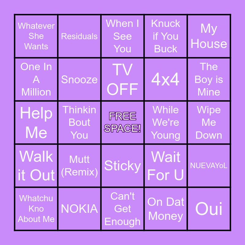 This bingo card has a free space and 24 words: Mutt (Remix), NOKIA, TV OFF, Whatchu Kno About Me, My House, Whatever She Wants, One In A Million, Residuals, While We're Young, Sticky, 4x4, Help Me, Wait For U, NUEVAYoL, Snooze, On Dat Money, Wipe Me Down, When I See You, The Boy is Mine, Thinkin Bout You, Oui, Walk it Out, Knuck if You Buck and Can't Get Enough.