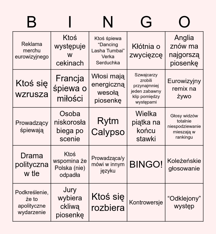 This bingo card has 25 words: Ktoś wspomina że Polska (nie) odpadła, Ktoś się rozbiera, Włosi mają energiczną wesołą piosenkę, Podkreślenie, że to apolityczne wydarzenie, Anglia znów ma najgorszą piosenkę, Reklama merchu eurowizyjnego, Ktoś się wzrusza, Ktoś występuje w cekinach, Wielka piątka na końcu stawki, Prowadząca/y mówi w innym języku, Szwajcarzy zrobili przynajmniej jeden zabawny klip pomiędzy występami, Prowadzący śpiewają, BINGO!, Koleżeńskie głosowanie, Francja śpiewa o miłości, “Odklejony” występ, Głosy widzów totalnie niespodziewanie mieszają w rankingu, Ktoś śpiewa “Dancing Lasha Tumbai” Verka Serduchka, Eurowizyjny remix na żywo, Osoba niskorosła biega po scenie, Rytm Calypso, Jury wybiera ckliwą piosenkę, Drama polityczna w tle, Kłótnia o zwycięzcę and Kontrowersje.
