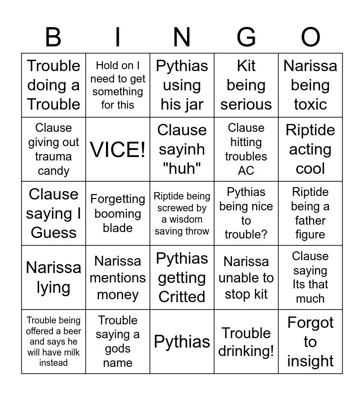This bingo card has 30 words: Trouble saying a gods name, Trouble mentions patty, Forgetting booming blade, Trouble mentioning his longing for alcohol, Trouble doing a Trouble, Pythias using his jar, VICE!, Pythias getting Critted, Pythias being nice to trouble?, Pythias, Riptide being a father figure, Riptide being screwed by a wisdom saving throw, Trouble drinking!, Forgot to insight, Riptide acting cool, Narissa narissa, Narissa unable to stop kit, Narissa lying, Narissa mentions money, Narissa being toxic, Clause saying I Guess, Kit claiming another gem, Hold on I need to get something for this, Clause hitting troubles AC, Clause giving out trauma candy, Kit being serious, Clause saying Its that much, Trouble being offered a beer and says he will have milk instead, Clause sayinh "huh" and Disagreement unfolds in group.