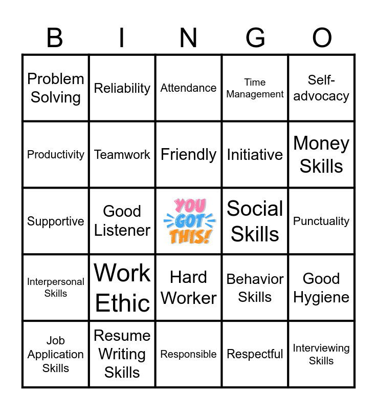 This bingo card has a free space and 24 words: Work Ethic, Resume Writing Skills, Friendly, Job Application Skills, Self-advocacy, Problem Solving, Productivity, Reliability, Social Skills, Hard Worker, Initiative, Supportive, Behavior Skills, Good Hygiene, Teamwork, Respectful, Punctuality, Attendance, Money Skills, Good Listener, Interviewing Skills, Interpersonal Skills, Time Management and Responsible.