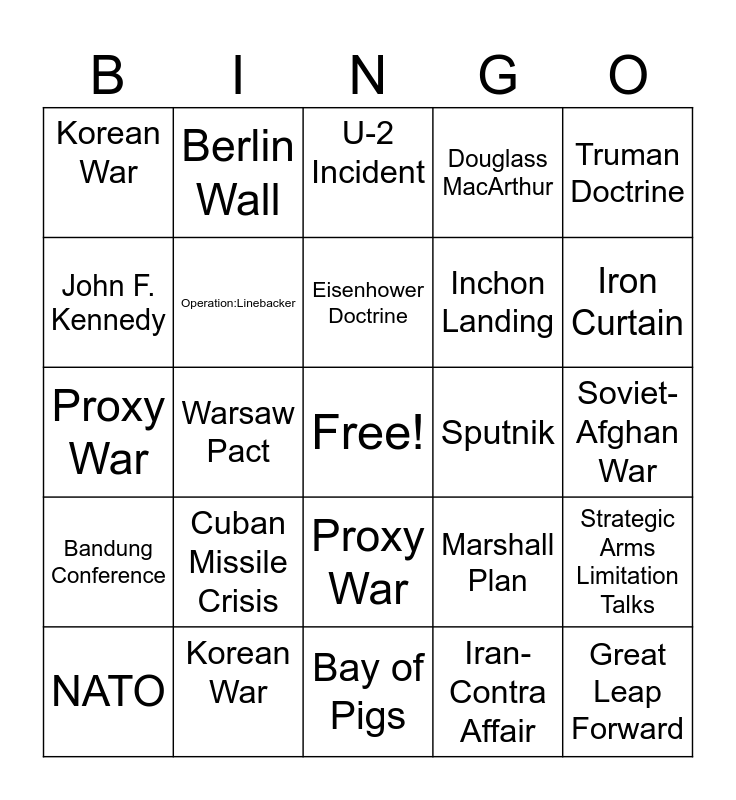 This bingo card has a free space and 24 words: Cuban Missile Crisis, Korean War, Eisenhower Doctrine, NATO, Truman Doctrine, Korean War, John F. Kennedy, Berlin Wall, Sputnik, Proxy War, Inchon Landing, Proxy War, Marshall Plan, Strategic Arms Limitation Talks, Operation:Linebacker, Iran-Contra Affair, Soviet-Afghan War, U-2 Incident, Iron Curtain, Warsaw Pact, Great Leap Forward, Bandung Conference, Douglass MacArthur and Bay of Pigs.