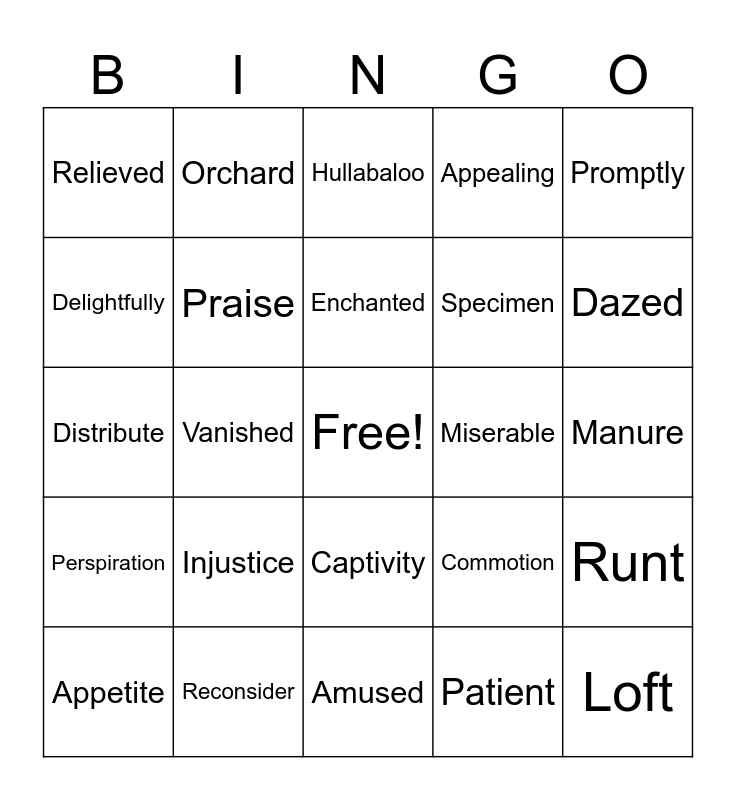 This bingo card has a free space and 27 words: Commotion, Scythes, Specimen, Amused, Delightfully, Hullabaloo, Orchard, Perspiration, Miserable, Runt, Distribute, Appealing, Appetite, Reconsider, Dazed, Instructions, Praise, Enchanted, Injustice, Relieved, Manure, Patient, Vanished, Loft, Captivity, Promptly and bingo.