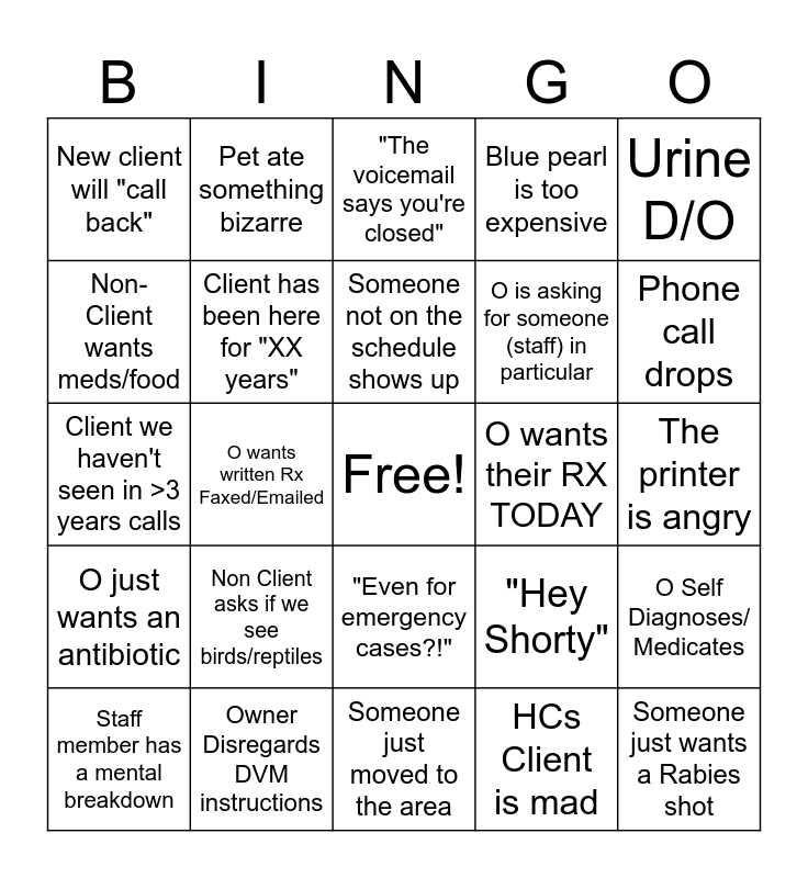 This bingo card has a free space and 56 words: Coughing dog walks in front door, Staff member has a mental breakdown, O walks in for Rx/Food (did not request ahead of time), New client will "call back", Someone just moved to the area, Ear infection needs to be seen urgently, Client has been here for "XX years", A regular calls, O is asking for someone (staff) in particular, O parks by the wrong side door, Blue pearl is too expensive, O asks about boarding, O is using their car bluetooth to call, Madeline drops/spills something, Dr. Jain squeezes something in, Spayded/ Distemperment, Urine D/O, O wants written Rx Faxed/Emailed, >10 min phone call, Someone just wants a Rabies shot, O wants their RX TODAY, O calls for sick pet after 10am, "Hey Shorty", "The voicemail says you're closed", O no-shows appointment, Someone not on the schedule shows up, Someone wants to speak to management (And won't say why), Other end is silent when answering, Phone call drops, Robocall, Dr. Jain gets paged to Nurse's/ Treatment, New Client Walks in to Establish, Client swears, Stapler jams, The printer is angry, Non-Client wants meds/food, Client we haven't seen in >3 years calls, On hold with another clinic, O just wants an antibiotic, Pet ate something bizarre, "Even for emergency cases?!", Cat isn't in carrier/ Dog doesn't have leash, "Run this transaction offline?", A Pam Called, Alii needs more food, Non Client asks if we see birds/reptiles, Owner Disregards DVM instructions, Client shares far too much information, Jaelynn gets covered in a bodily fluid, Someone brings us treats :), HCs Client is mad, "I just spoke to someone there", Pharmacy faxes Rx request, Impromed crashes, O Self Diagnoses/ Medicates and O wants ballpark estimate NOW.