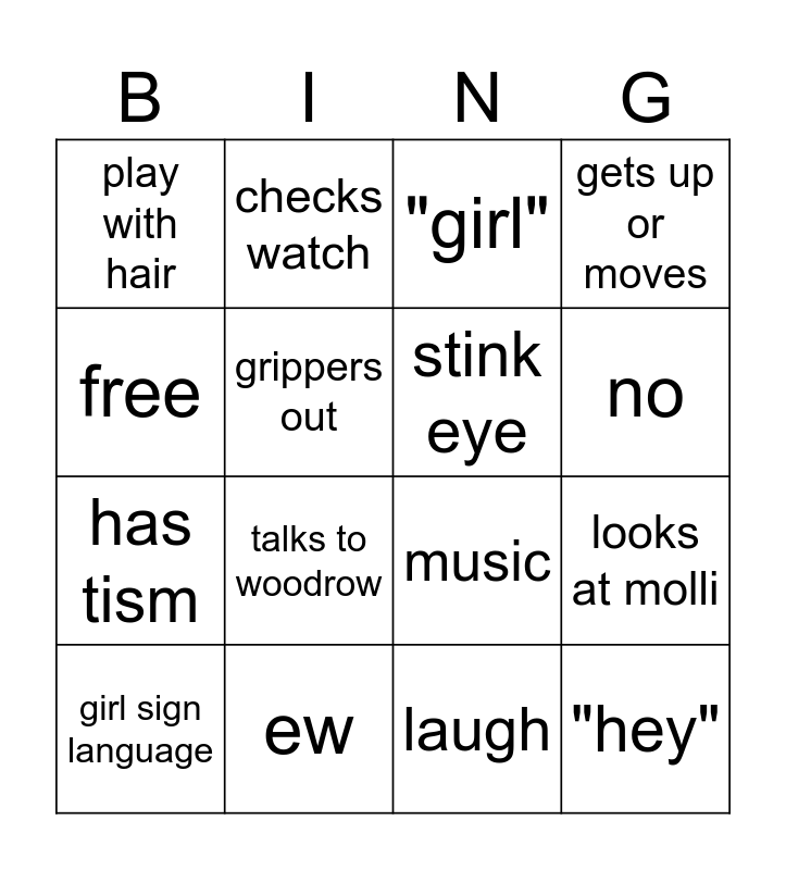 This bingo card has 17 words: laugh, girl sign language, "girl", play with hair, talks to woodrow, gets up or moves, looks at molli, stink eye, no, grippers out, ew, music, free, checks watch, has tism, free and "hey".