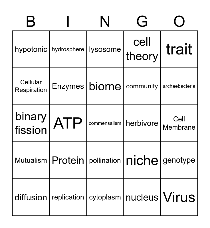 This bingo card has 48 words: Carbohydrates, commensalism, ribosome, cytoplasm, Protein, Osmosis, hydrosphere, selectively permeable, Cellular Respiration, heterozygous, Enzymes, cell theory, genotype, niche, chlorophyll, Abiotic, biome, herbivore, limiting factor, trait, ATP, nucleus, hypotonic, community, Genus and Species, archaebacteria, diffusion, tissue, pollination, Mutualism, RNA, genetics, temperate forest, AGCT, replication, diploid, pedigree, Cell Membrane, cytoskeleton, clone, prokaryote, Virus, lysosome, genome, binary fission, pathogens, antibiotic and angiosperm.