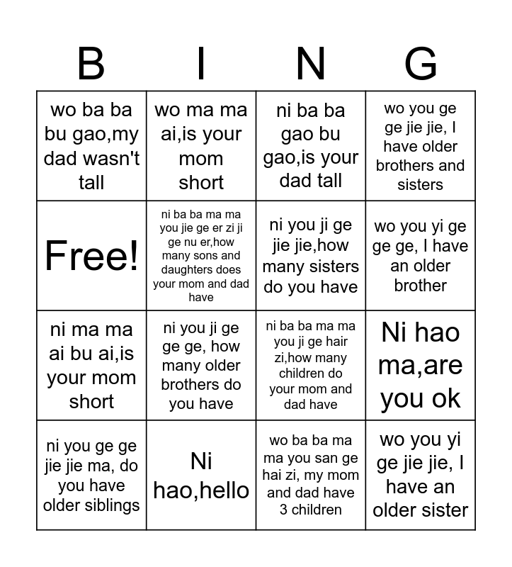 This bingo card has 16 words: Ni hao,hello, Ni hao ma,are you ok, ni ba ba gao bu gao,is your dad tall, wo ba ba bu gao,my dad wasn't tall, ni ma ma ai bu ai,is your mom short, wo ma ma ai,is your mom short, ni ba ba ma ma you ji ge hair zi,how many children do your mom and dad have, wo ba ba ma ma you san ge hai zi, my mom and dad have 3 children, Free!, ni ba ba ma ma you jie ge er zi ji ge nu er,how many sons and daughters does your mom and dad have, ni you ge ge jie jie ma, do you have older siblings, wo you ge ge jie jie, I have older brothers and sisters, ni you ji ge ge ge, how many older brothers do you have, wo you yi ge ge ge, I have an older brother, ni you ji ge jie jie,how many sisters do you have and wo you yi ge jie jie, I have an older sister.