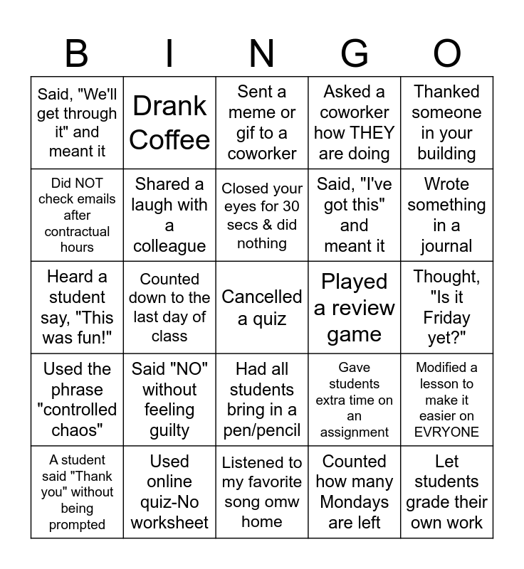 This bingo card has 50 words: Took a walk, Cancelled a quiz, Graded with music on, Listened to my favorite song omw home, Said "NO" without feeling guilty, Ate Chocolate, Drank Coffee, Had a real lunch, Did NOT check emails after contractual hours, Daydreamed about summer plans, Shared a laugh with a colleague, Asked a coworker how THEY are doing, Modified a lesson to make it easier on EVRYONE, Gave students extra time on an assignment, Took three deep breaths before class, Used a mindfulness app, Closed your eyes for 30 secs & did nothing, Played a review game, Threw away a pile on old papers, Thanked someone in your building, Counted down to the last day of class, Counted how many Mondays are left, Said, "We'll get through it" and meant it, Said, "I've got this" and meant it, Paused before replying to an irritating email, Let students grade their own work, Wrote something in a journal, Used Positive Self-Talk (I'm doing my best), Sent a meme or gif to a coworker, Had all students bring in a pen/pencil, Found time to go to the bathroom before 5th period, Finished a full cup of coffee while it was still hot, Got through zero tech issues, Shared snacks/treats with faculty, Used online quiz-No worksheet, Stepped outside during a prep period, Had a "just survive today" teaching moment, Lost the dry erase marker for the 10th time, Walked passed the copier today, Thought, "Is it Friday yet?", Let students lead part of a lesson, Vented with a teammate (constructively...), Heard, "You are not alone" & believed it, Enjoyed a class discussion, A student said "Thank you" without being prompted, Heard a student say, "This was fun!", Saw a quiet student finally raise their hand, Considered throwing your Chromebook out the window (but didn't), Used the phrase "controlled chaos" and Let yourself be "good enough" instead of perfect.