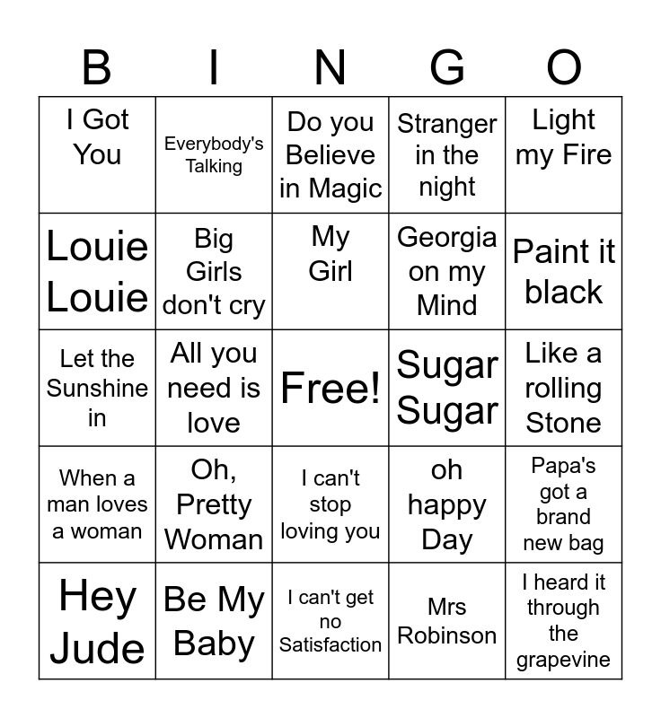 This bingo card has a free space and 24 words: Oh, Pretty Woman, Be My Baby, My Girl, Hey Jude, Light my Fire, I Got You, Louie Louie, Everybody's Talking, Sugar Sugar, I can't stop loving you, Georgia on my Mind, Let the Sunshine in, oh happy Day, Papa's got a brand new bag, Big Girls don't cry, Mrs Robinson, Like a rolling Stone, Do you Believe in Magic, Paint it black, All you need is love, I heard it through the grapevine, When a man loves a woman, Stranger in the night and I can't get no Satisfaction.