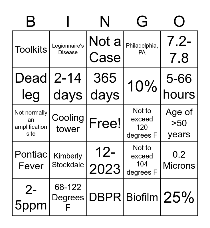 This bingo card has a free space and 28 words: 0.2 Microns, Serogroup 1, 10%, Biofilm, Dead leg, Not a Case, Legionnaire's Disease, Pontiac Fever, Not to exceed 120 degrees F, 2-5ppm, Not normally an amplification site, Philadelphia, PA, 68-122 Degrees F, DBPR, 5-66 hours, Travel associated, Kimberly Stockdale, 2-14 days, 365 days, 12-2023, Toolkits, 1992, 25%, Cooling tower, Age of >50 years, Not to exceed 104 degrees F, 7.2-7.8 and Urine Antigen.