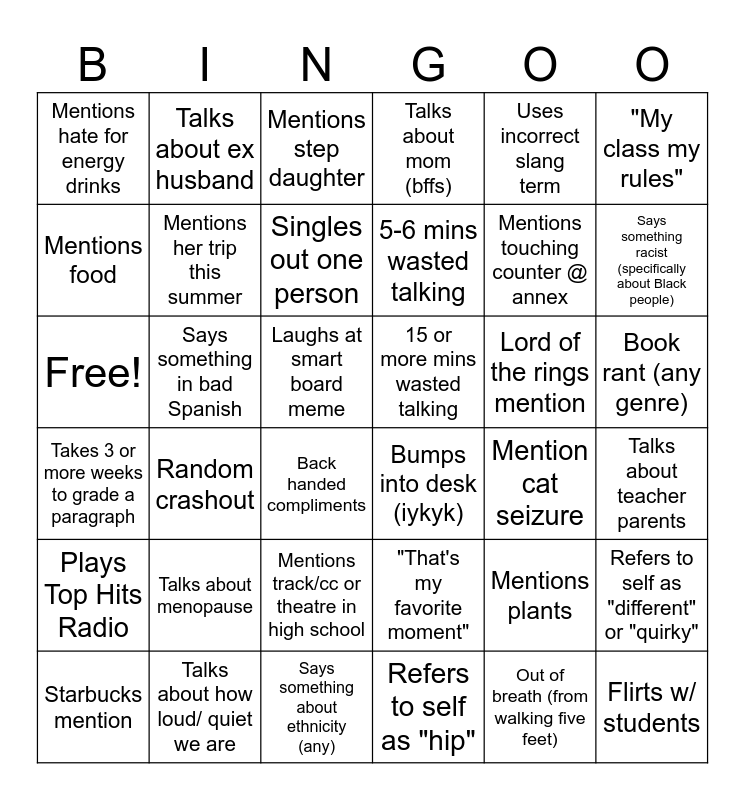 This bingo card has 36 words: "That's my favorite moment", Mentions track/cc or theatre in high school, Refers to self as "hip", Mentions food, Takes 3 or more weeks to grade a paragraph, 15 or more mins wasted talking, Mentions her trip this summer, Says something about ethnicity (any), Uses incorrect slang term, Mentions plants, Says something racist (specifically about Black people), Talks about mom (bffs), Refers to self as "different" or "quirky", Says something in bad Spanish, 5-6 mins wasted talking, Mentions hate for energy drinks, Plays Top Hits Radio, Lord of the rings mention, Free!, Mentions step daughter, Laughs at smart board meme, Random crashout, Bumps into desk (iykyk), Back handed compliments, Mention cat seizure, Talks about ex husband, Mentions touching counter @ annex, Talks about how loud/ quiet we are, Singles out one person, "My class my rules", Flirts w/ students, Starbucks mention, Talks about teacher parents, Book rant (any genre), Talks about menopause and Out of breath (from walking five feet).
