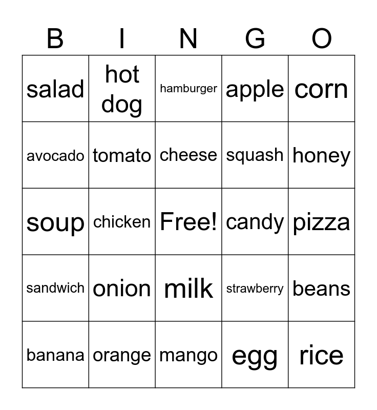 This bingo card has a free space and 27 words: strawberry, lettuce, squash, mango, avocado, hamburger, hot dog, sandwich, candy, beans, soup, apple, banana, orange, honey, pepper, tomato, cheese, onion, salad, pizza, egg, chicken, rice, milk, corn and bread.