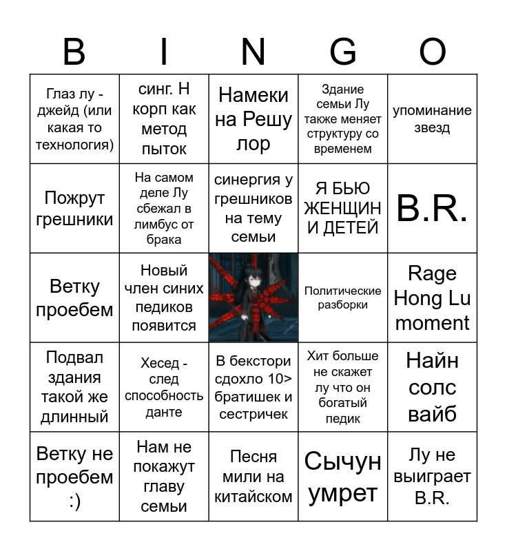 This bingo card has a free space and 24 words: Хесед - след способность данте, Нам не покажут главу семьи, синергия у грешников на тему семьи, Ветку не проебем :), упоминание звезд, Глаз лу - джейд (или какая то технология), Пожрут грешники, синг. Н корп как метод пыток, Политические разборки, В бекстори сдохло 10> братишек и сестричек, Я БЬЮ ЖЕНЩИН И ДЕТЕЙ, Ветку проебем, Хит больше не скажет лу что он богатый педик, Найн солс вайб, На самом деле Лу сбежал в лимбус от брака, Сычун умрет, Rage Hong Lu moment, Намеки на Решу лор, B.R., Новый член синих педиков появится, Лу не выиграет B.R., Подвал здания такой же длинный, Здание семьи Лу также меняет структуру со временем and Песня мили на китайском.