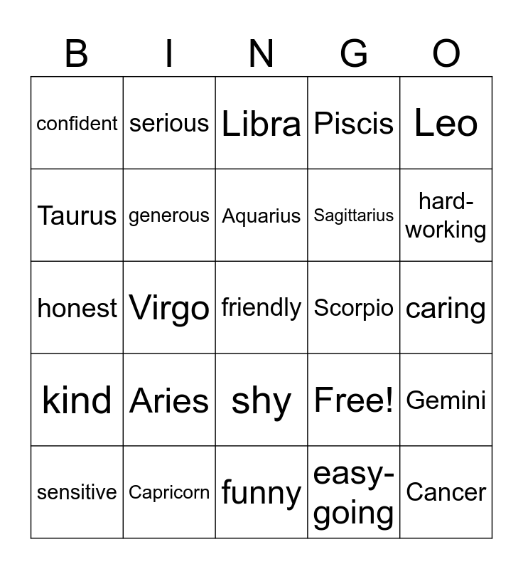 This bingo card has 25 words: Aries, funny, Aquarius, sensitive, Leo, confident, Taurus, serious, Scorpio, shy, Sagittarius, honest, Free!, Gemini, generous, Cancer, caring, Libra, hard-working, Virgo, friendly, Capricorn, kind, Piscis and easy-going.