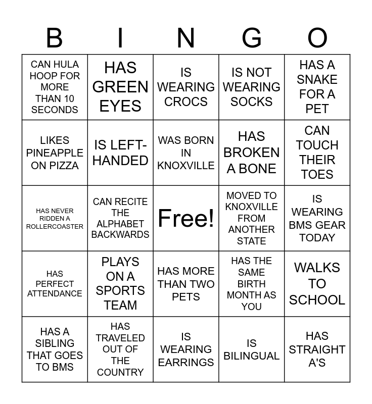 This bingo card has a free space and 24 words: PLAYS ON A SPORTS TEAM, HAS TRAVELED OUT OF THE COUNTRY, WAS BORN IN KNOXVILLE, HAS A SIBLING THAT GOES TO BMS, HAS A SNAKE FOR A PET, CAN HULA HOOP FOR MORE THAN 10 SECONDS, LIKES PINEAPPLE ON PIZZA, HAS GREEN EYES, MOVED TO KNOXVILLE FROM ANOTHER STATE, HAS MORE THAN TWO PETS, HAS BROKEN A BONE, HAS NEVER RIDDEN A ROLLERCOASTER, HAS THE SAME BIRTH MONTH AS YOU, WALKS TO SCHOOL, IS LEFT-HANDED, IS BILINGUAL, IS WEARING BMS GEAR TODAY, IS WEARING CROCS, CAN TOUCH THEIR TOES, CAN RECITE THE ALPHABET BACKWARDS, HAS STRAIGHT A'S, HAS PERFECT ATTENDANCE, IS NOT WEARING SOCKS and IS WEARING EARRINGS.