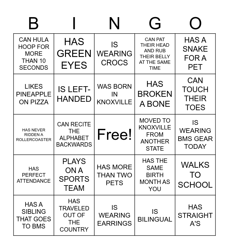 This bingo card has a free space and 24 words: PLAYS ON A SPORTS TEAM, HAS TRAVELED OUT OF THE COUNTRY, WAS BORN IN KNOXVILLE, HAS A SIBLING THAT GOES TO BMS, HAS A SNAKE FOR A PET, CAN HULA HOOP FOR MORE THAN 10 SECONDS, LIKES PINEAPPLE ON PIZZA, HAS GREEN EYES, MOVED TO KNOXVILLE FROM ANOTHER STATE, HAS MORE THAN TWO PETS, HAS BROKEN A BONE, HAS NEVER RIDDEN A ROLLERCOASTER, HAS THE SAME BIRTH MONTH AS YOU, WALKS TO SCHOOL, IS LEFT-HANDED, IS BILINGUAL, IS WEARING BMS GEAR TODAY, IS WEARING CROCS, CAN TOUCH THEIR TOES, CAN RECITE THE ALPHABET BACKWARDS, HAS STRAIGHT A'S, HAS PERFECT ATTENDANCE, CAN PAT THEIR HEAD AND RUB THEIR BELLY AT THE SAME TIME and IS WEARING EARRINGS.