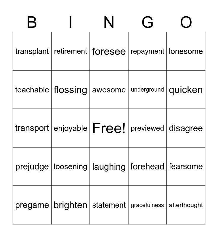 This bingo card has a free space and 29 words: pregame, disbelief, enjoyable, actor, transplant, foresee, flossing, loosening, previewed, brighten, disagree, afterthought, statement, gracefulness, quicken, painter, laughing, prejudge, lonesome, transport, forehead, discovered, underground, teachable, repayment, retirement, fearsome, awesome and aftertaste.