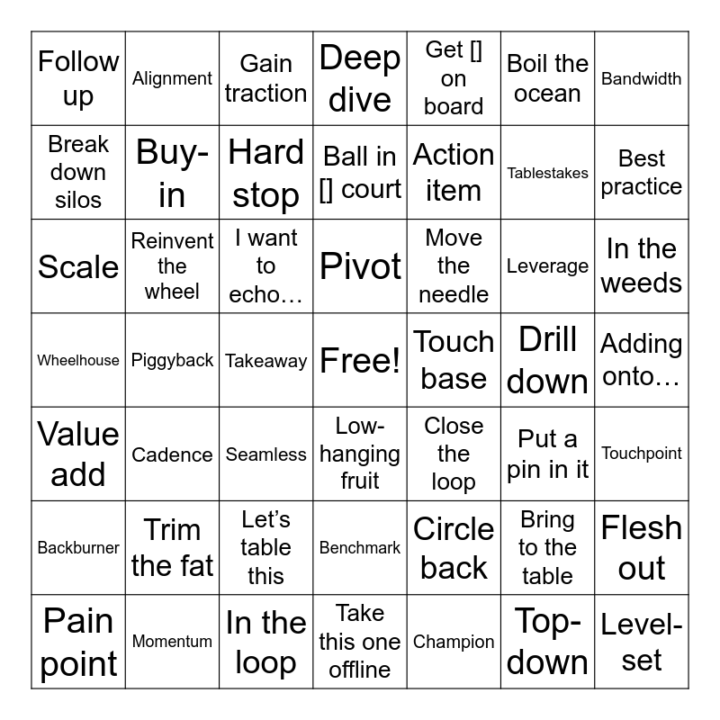 This bingo card has a free space and 48 words: Circle back, Tablestakes, Take this one offline, Piggyback, I want to echo…, Adding onto…, Alignment, Momentum, Boil the ocean, Low-hanging fruit, Bandwidth, Deep dive, Leverage, Move the needle, Backburner, Drill down, Break down silos, Best practice, Bring to the table, Get [] on board, Action item, Takeaway, Follow up, Buy-in, Flesh out, Hard stop, In the weeds, Pain point, Pivot, Reinvent the wheel, Top-down, Touch base, Touchpoint, Trim the fat, Wheelhouse, Close the loop, Put a pin in it, Scale, Seamless, Let’s table this, Value add, Level-set, Gain traction, In the loop, Ball in [] court, Benchmark, Cadence and Champion.