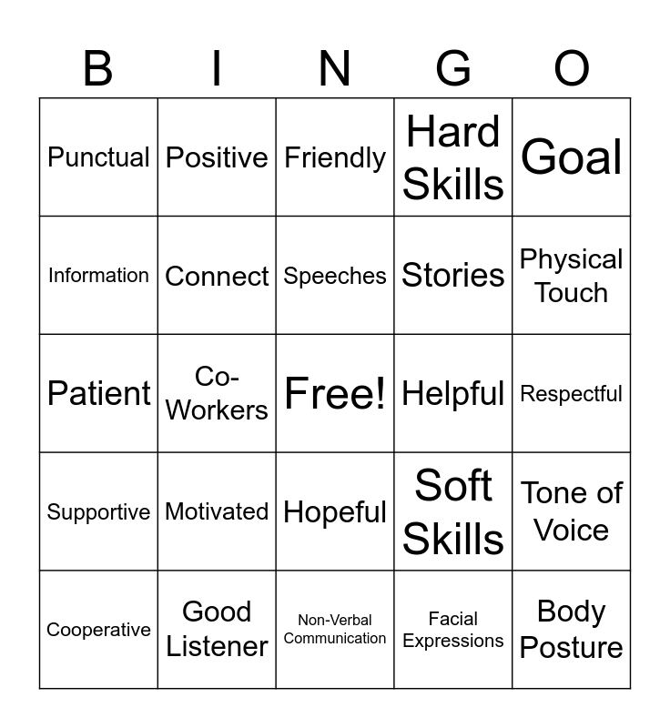 This bingo card has a free space and 43 words: Attitude, Body Posture, Communication, Cooperative, Eye Contact, Facial Expressions, Friendly, Gestures, Goal, Good Listener, Hard Skills, Helpful, Hopeful, Motivated, Negative, Non-Verbal Communication, Optimistic, Patient, Pessimistic, Physical Touch, Positive, Productive, Professionalism, Punctual, Reliable, Respectful, Responsible, Sign Language, Soft Skills, Supportive, Teamwork, Tone of Voice, Verbal Communication, Co-Workers, Supervisors, Conversations, Presentations, Speeches, Information, Stories, Questions, Connect and Sharing Ideas.