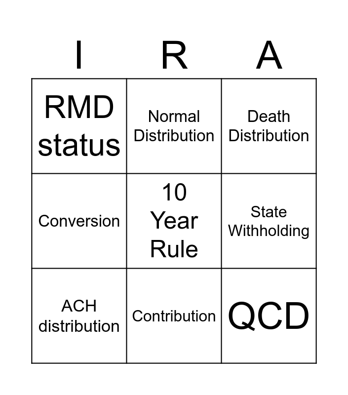 This bingo card has 27 words: Auto RMD, Roth, QCD, Pay To, State Withholding, Death Distribution, Normal Distribution, Traditional IRA, Inherited IRA, Missing Account Numbers, Election of Payment, Conversion, Charity W9, Charity EIN, Waive Federal Taxes, Waive State Taxes, ACH distribution, Contribution, Distribution, RMD status, IN/MI taxes, Tax Beneficiary-Death Beneficary, Description Code, Treatment Code, Charitable Donation, 10 Year Rule and Backdoor Roth Conversion.