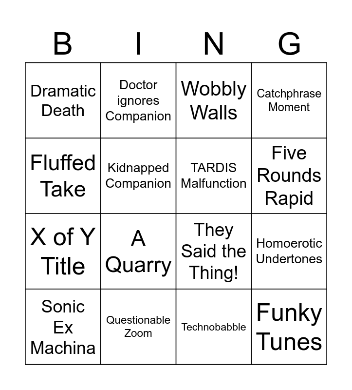 This bingo card has 16 words: Questionable Zoom, Homoerotic Undertones, Wobbly Walls, Dramatic Death, X of Y Title, Doctor ignores Companion, They Said the Thing!, Technobabble, Fluffed Take, Kidnapped Companion, Sonic Ex Machina, Catchphrase Moment, A Quarry, Five Rounds Rapid, TARDIS Malfunction and Funky Tunes.