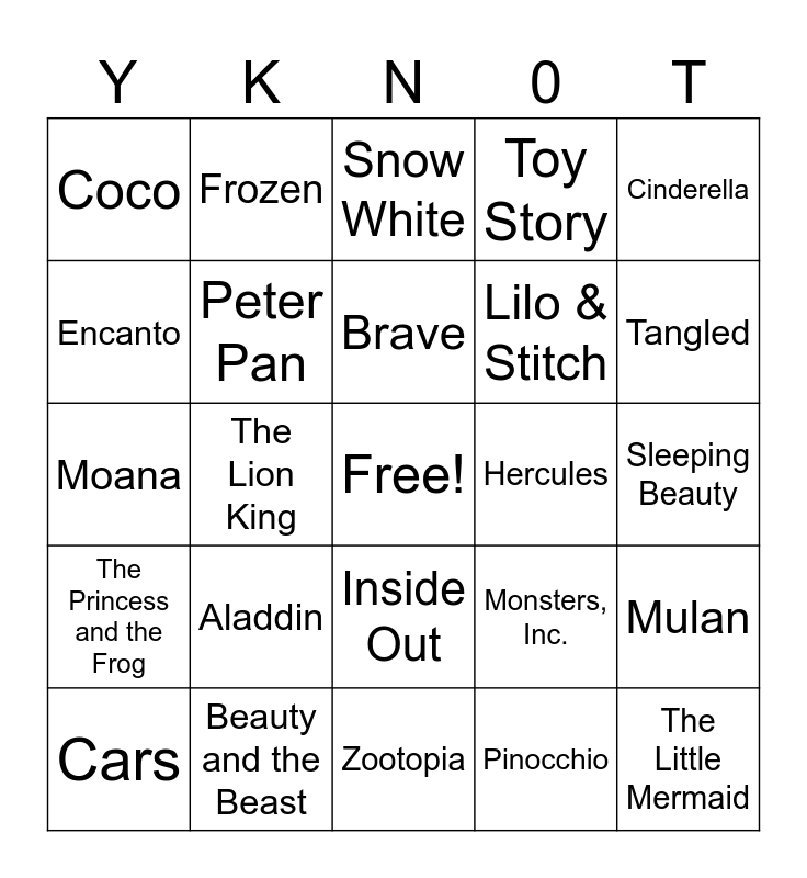 This bingo card has a free space and 24 words: Aladdin, Beauty and the Beast, Brave, Cars, Cinderella, Coco, Encanto, Frozen, Hercules, Inside Out, Lilo & Stitch, Moana, Monsters, Inc., Mulan, Peter Pan, Pinocchio, Sleeping Beauty, Snow White, Tangled, The Lion King, The Little Mermaid, The Princess and the Frog, Toy Story and Zootopia.