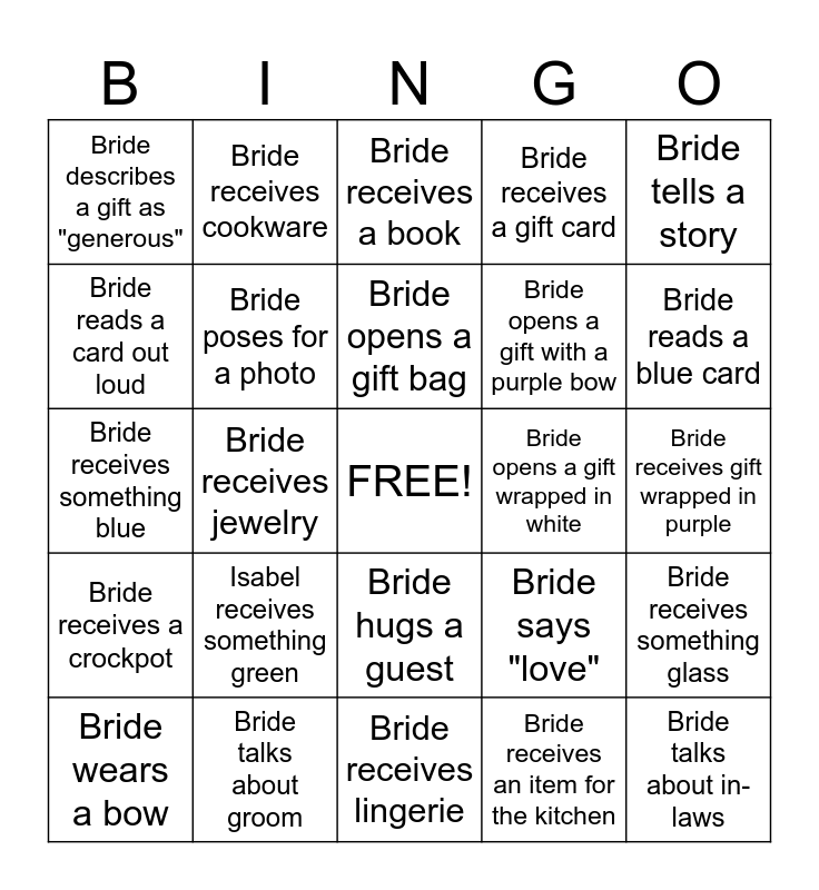 This bingo card has a free space and 24 words: Isabel receives something green, Bride talks about groom, Bride opens a gift bag, Bride wears a bow, Bride tells a story, Bride describes a gift as "generous", Bride reads a card out loud, Bride receives cookware, Bride opens a gift wrapped in white, Bride hugs a guest, Bride opens a gift with a purple bow, Bride receives something blue, Bride says "love", Bride receives something glass, Bride poses for a photo, Bride receives an item for the kitchen, Bride receives gift wrapped in purple, Bride receives a book, Bride reads a blue card, Bride receives jewelry, Bride talks about in-laws, Bride receives a crockpot, Bride receives a gift card and Bride receives lingerie.