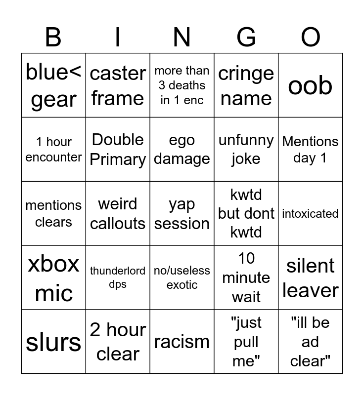 This bingo card has 25 words: thunderlord dps, racism, ego damage, slurs, oob, blue< gear, 1 hour encounter, caster frame, kwtd but dont kwtd, no/useless exotic, unfunny joke, mentions clears, 10 minute wait, silent leaver, Double Primary, "ill be ad clear", intoxicated, more than 3 deaths in 1 enc, Mentions day 1, weird callouts, yap session, 2 hour clear, xbox mic, cringe name and "just pull me".