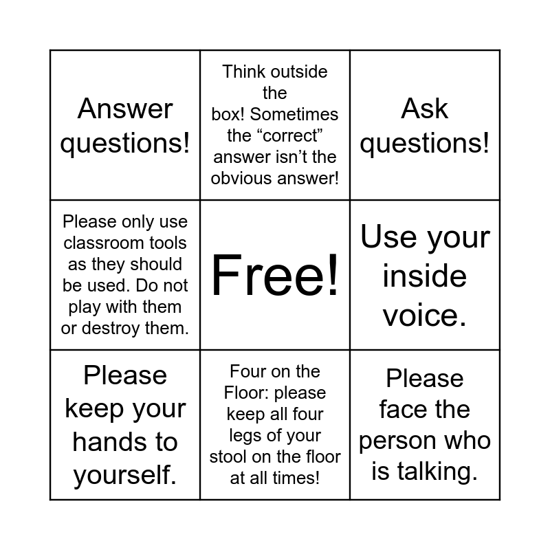 This bingo card has a free space and 16 words: Please sit up straight on the carpet. Do not lay down on your side, stomach, or back., Pick a spot and stay. Please do not move around on the carpet or in the classroom (unless you have permission)., Ask questions!, Answer questions!, Even if you think you are wrong, don’t be afraid to ask or answer. Just be sure to raise your hand and wait to be called on first., Think outside the box! Sometimes the “correct” answer isn’t the obvious answer!, Please be quiet while teachers or other students are talking., Please raise your hand and wait to be called on if you have a question or comment to share., Please face the person who is talking., Use your inside voice., Be kind to other students., Please only use classroom tools as they should be used. Do not play with them or destroy them., Please only walk in the classroom. Do not run or play around in the classroom., Four on the Floor: please keep all four legs of your stool on the floor at all times!, Please keep your hands to yourself. and Please ask before you leave the classroom for any reason, and please let the teachers know where you are going..