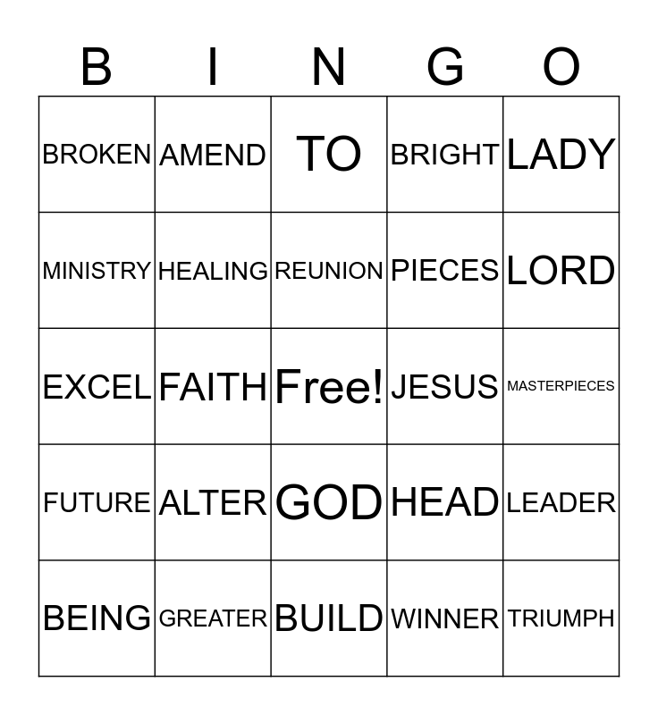 This bingo card has a free space and 25 words: ALTER, BUILD, REUNION, BEING, LADY, BROKEN, MINISTRY, AMEND, JESUS, GOD, PIECES, EXCEL, HEAD, LEADER, HEALING, PIECES, MASTERPIECES, TO, LORD, FAITH, TRIUMPH, GREATER, FUTURE, BRIGHT and WINNER.