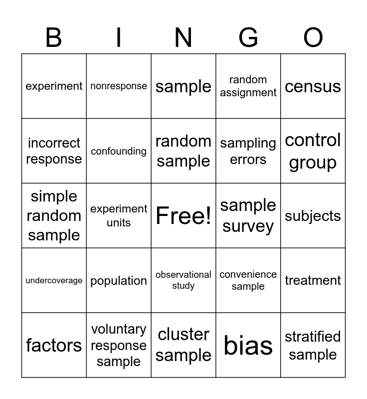 This bingo card has a free space and 24 words: population, voluntary response sample, random sample, factors, census, experiment, incorrect response, nonresponse, sample survey, observational study, sampling errors, simple random sample, convenience sample, treatment, confounding, bias, subjects, sample, control group, experiment units, stratified sample, undercoverage, random assignment and cluster sample.