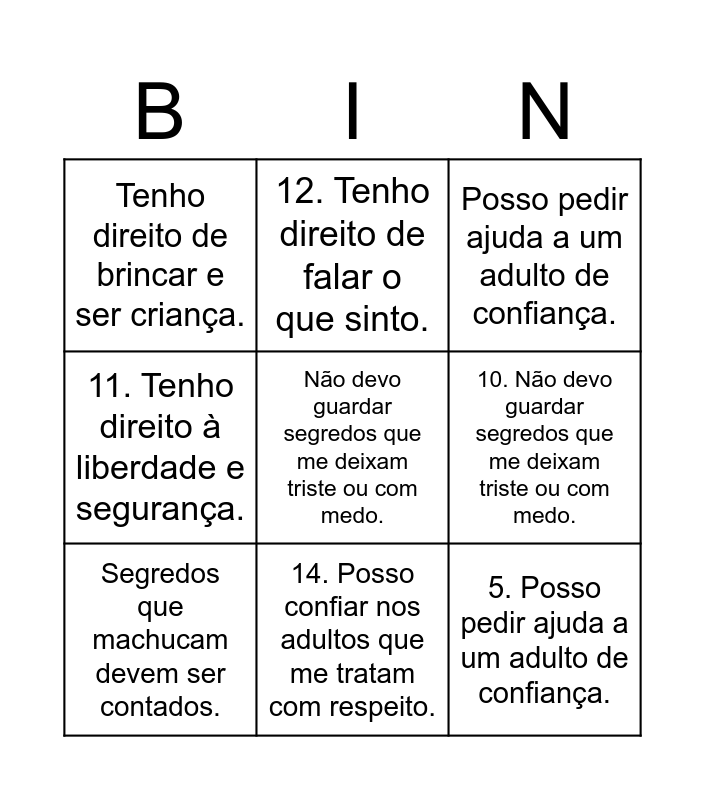 This bingo card has a free space and 29 words: Tenho direito ao carinho e ao respeito., Tenho direito de dizer “não” se algo me deixa desconfortável., Um abraço só é bom se eu quiser., Meu corpo é meu, ninguém pode tocá-lo sem minha permissão., Tenho direito de brincar e ser criança., Posso pedir ajuda a um adulto de confiança., Segredos que machucam devem ser contados., A escola também é um lugar de proteção, Não é minha culpa se um adulto faz algo errado comigo., Tenho direito de ser protegido contra violência., Tenho direito à liberdade e segurança., Tenho direito de falar o que sinto., Posso confiar nos adultos que me tratam com respeito., Ninguém pode me obrigar a fazer algo que me machuca., 1. Tenho direito ao carinho e ao respeito., 2. Meu corpo é meu, ninguém pode tocá-lo sem minha permissão., 3. Tenho direito de dizer “não” se algo me deixa desconfortável., 4. Segredos que machucam devem ser contados., 5. Posso pedir ajuda a um adulto de confiança., 6. Tenho direito de brincar e ser criança., 7. Não é minha culpa se um adulto faz algo errado comigo., 8. Tenho direito de ser protegido contra violência., 9. A escola também é um lugar de proteção., 10. Não devo guardar segredos que me deixam triste ou com medo., 11. Tenho direito à liberdade e segurança., 12. Tenho direito de falar o que sinto., 13. Um abraço só é bom se eu quiser., 14. Posso confiar nos adultos que me tratam com respeito. and 15. Ninguém pode me obrigar a fazer algo que me machuca..