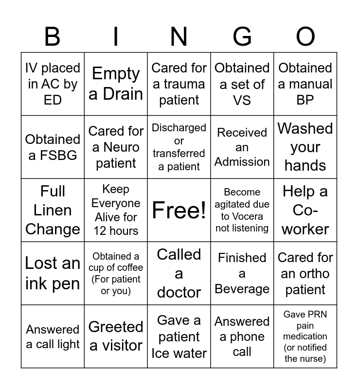 This bingo card has a free space and 24 words: Obtained a cup of coffee (For patient or you), Greeted a visitor, Discharged or transferred a patient, Answered a call light, Obtained a manual BP, IV placed in AC by ED, Obtained a FSBG, Empty a Drain, Become agitated due to Vocera not listening, Called a doctor, Received an Admission, Full Linen Change, Finished a Beverage, Cared for an ortho patient, Cared for a Neuro patient, Answered a phone call, Help a Co-worker, Cared for a trauma patient, Washed your hands, Keep Everyone Alive for 12 hours, Gave PRN pain medication (or notified the nurse), Lost an ink pen, Obtained a set of VS and Gave a patient Ice water.