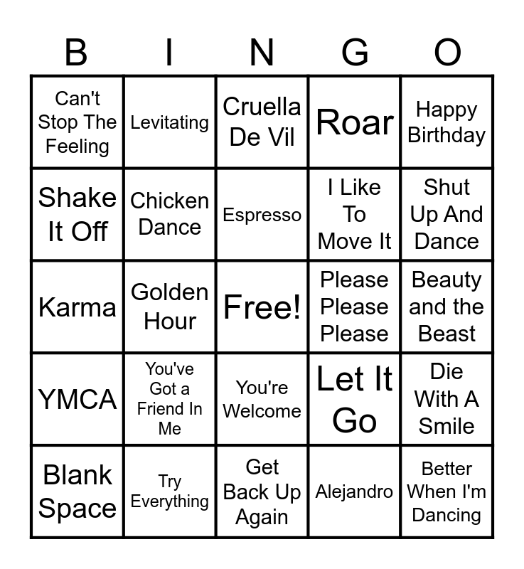This bingo card has a free space and 32 words: Alejandro, Savage Love, Golden Hour, Eye of the Tiger, YMCA, Chicken Dance, Happy Birthday, Die With A Smile, Levitating, Dance the Night, Espresso, Cruella De Vil, Macarena, Baby, Please Please Please, You Belong With Me, Blank Space, Karma, You're Welcome, You've Got a Friend In Me, Let It Go, We're All In This Together, Beauty and the Beast, Try Everything, Better When I'm Dancing, Roar, I Like To Move It, Shake It Off, Can't Stop The Feeling, Get Back Up Again, Popular and Shut Up And Dance.