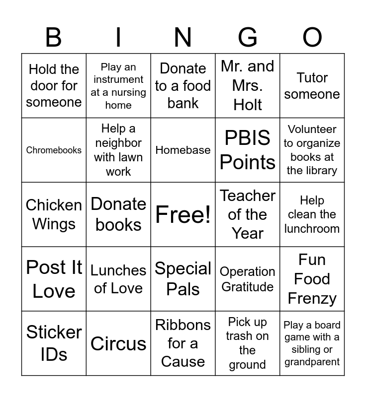 This bingo card has a free space and 31 words: Ribbons for a Cause, Ascent Care Hospice, Donate books, Donate clothes, Hold the door for someone, Donate to a food bank, Help a neighbor with lawn work, Operation Gratitude, Teacher of the Year, Pick up trash on the ground, Help clean the lunchroom, Play a board game with a sibling or grandparent, Make a positive post about someone, Help a family member with a chore, Volunteer to organize books at the library, Pep Rally, Fun Food Frenzy, Lunches of Love, Post It Love, Special Pals, Tutor someone, Volunteer to babysit, Sticker IDs, Play an instrument at a nursing home, PBIS Points, Chromebooks, Mr. and Mrs. Holt, Chicken Wings, Circus, Homebase and Real Friends.