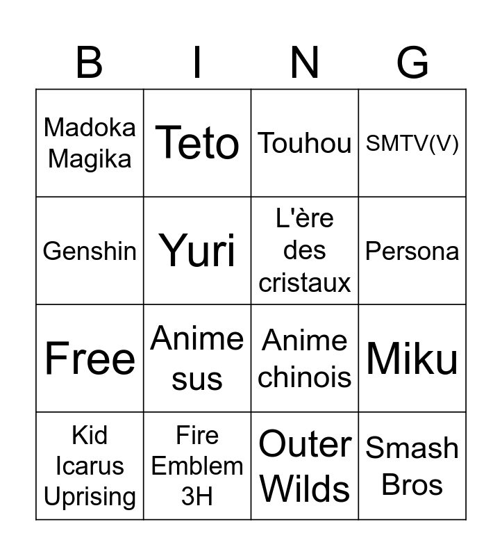 This bingo card has 16 words: Fire Emblem 3H, Miku, Touhou, Madoka Magika, Free, Teto, Anime chinois, Outer Wilds, Genshin, Yuri, Kid Icarus Uprising, SMTV(V), Anime sus, Persona, L'ère des cristaux and Smash Bros.