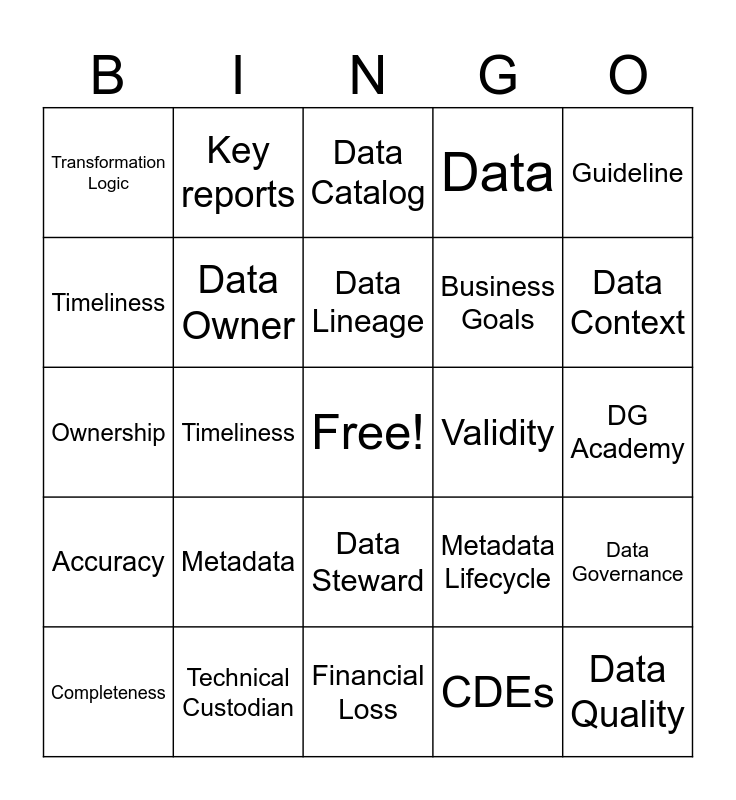 This bingo card has a free space and 24 words: Metadata, Technical Custodian, Data Lineage, Completeness, Guideline, Transformation Logic, Timeliness, Key reports, Validity, Data Steward, Business Goals, Ownership, Metadata Lifecycle, Data Governance, Data Owner, CDEs, DG Academy, Data Catalog, Data Context, Timeliness, Data Quality, Accuracy, Data and Financial Loss.