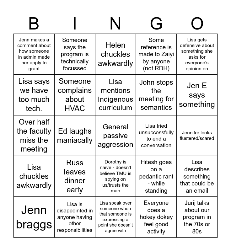 This bingo card has a free space and 26 words: Dorothy is naive - doesn’t believe TMU is spying on us/trusts the man, Everyone does a hokey dokey feel good activity, Lisa mentions Indigenous curriculum, Lisa is disappointed in anyone having other responsibilities, Lisa gets defensive about something she asks for everyone’s opinion on, Jenn makes a comment about how someone in admin made her apply to grant, Lisa says we have too much tech., Someone says the program is technically focussed, Jennifer looks flustered/scared, Hitesh goes on a pedantic rant - while standing, John stops the meeting for semantics, Over half the faculty miss the meeting, Lisa describes something that could be an email, Jenn braggs, Ed laughs maniacally, Cheryl name drops, Some reference is made to Zaiyi by anyone (not RDH), Lisa chuckles awkwardly, Helen chuckles awkwardly, Jurij talks about our program in the 70s or 80s, Jen E says something, Lisa speak over someone when that someone is expressing a point she doesn’t agree with, Lisa tried unsuccessfully to end a conversation, Russ leaves dinner early, Someone complains about HVAC and Argument ensues over the DAS mission discussion.