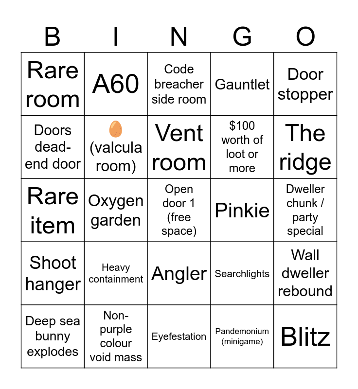 This bingo card has a free space and 44 words: Dredge, Blitz, Man from the mindscape, Deep sea bunny explodes, P.AI.NTER, Pandemonium (minigame), Code breacher side room, Deep sea bunnies, Door stopper, Non-purple colour void mass, Gauntlet, Pinkie, Angler, Heavy containment, Flooded rooms, Eyefestation, Froger, Rare item, Pandemonium (no minigame), The ridge, A60, Chainsmoker, Mirage, Rare room, Trenchbleeder room, Dweller chunk / party special, Random purple keycard room, Rooms, Searchlights, Shoot hanger, Same angler variant twice in a row, Wall dweller rebound, 3+ good people in 1 room, Unreachable good people door, Oxygen garden, Paranoia box, Lava, Steam, Vent room, Doors dead-end door, $100 worth of loot or more, $2500 research, 🥚 (valcula room) and Blue + purple keycard room.