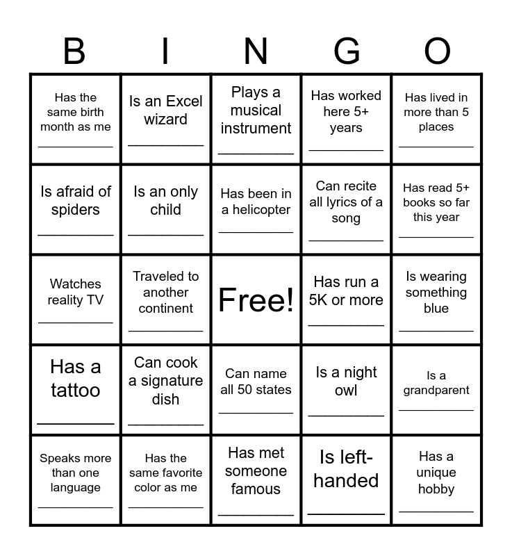 This bingo card has a free space and 29 words: Speaks more than one language ___________, Has a pet _______, Traveled to another continent __________, Loves true crime shows __________, Has the same birth month as me ___________, Plays a musical instrument _________, Is an only child _________, Can cook a signature dish _________, Has run a 5K or more _________, Has the same favorite color as me ___________, Is wearing something blue __________, Has a unique hobby __________, Has met someone famous _________, Is left-handed _______, Has read 5+ books so far this year ___________, Loves spicy foods _________, Can name all 50 states __________, Has a tattoo _______, Has lived in more than 5 places ___________, Watches reality TV __________, Is a night owl _________, Speaks with an accent _________, Can recite all lyrics of a song __________, Is afraid of spiders _________, Has worked here 5+ years __________, Is an Excel wizard _________, Is a grandparent ___________, Has been in a helicopter __________ and Is a veteran ________.