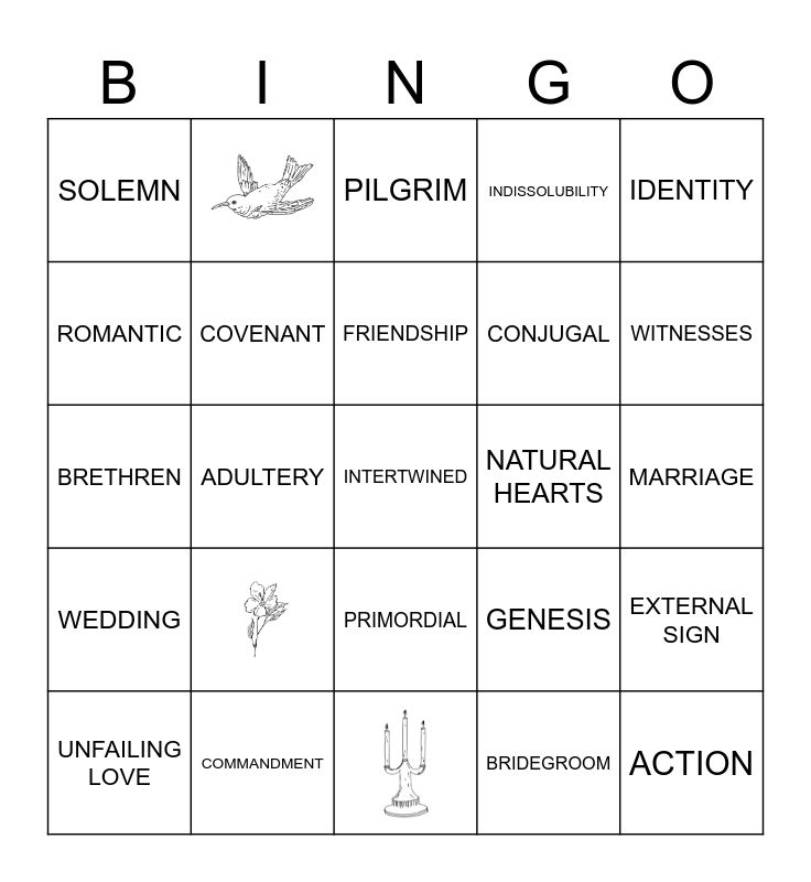 This bingo card has 5 images and 30 words: CONSCIENCE, EVANGELICAL, STEWARDESS, COVENANT, PRIMORDIAL, INDISSOLUBILITY, ROMANTIC, EXPRESSION, FRIENDSHIP, AFFECTION, BRETHREN, IDENTITY, UNITED, THE LOVER, SOLEMN, NATURAL HEARTS, BRIDEGROOM, ADULTERY, WEDDING, INTERTWINED, GENESIS, UNFAILING LOVE, EXTERNAL SIGN, COMMANDMENT, PILGRIM, WITNESSES, ACTION, REVERENCE, CONJUGAL and MARRIAGE.