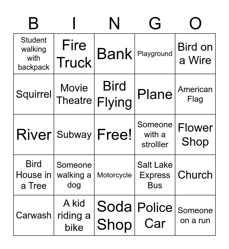 This bingo card has a free space and 29 words: Carwash, Crosswalk, Subway, Temple, Student walking with backpack, Bank, Movie Theatre, Someone walking a dog, Someone with a strolller, A kid riding a bike, Flower Shop, Someone on a run, Soda Shop, Police Car, American Flag, Fire Hydrant, Motorcycle, Bird House in a Tree, Bird on a Wire, River, Salt Lake Express Bus, Yellow Light, Plane, Squirrel, Playground, Fire Truck, Church, Bird Flying and Green Vehicle.