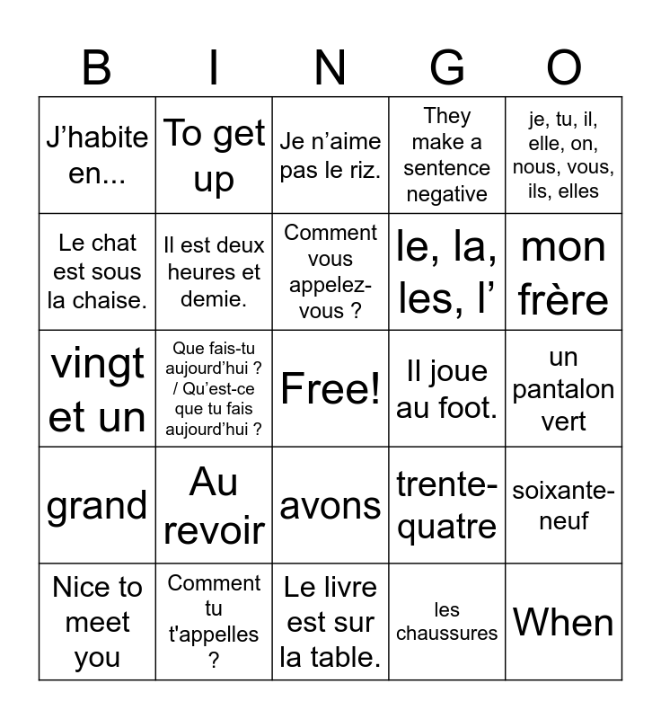 This bingo card has a free space and 24 words: Au revoir, Comment tu t'appelles ?, Comment vous appelez-vous ?, Nice to meet you, je, tu, il, elle, on, nous, vous, ils, elles, J’habite en..., Le chat est sous la chaise., To get up, Il joue au foot., avons, le, la, les, l’, vingt et un, trente-quatre, soixante-neuf, Il est deux heures et demie., les chaussures, un pantalon vert, Je n’aime pas le riz., mon frère, Que fais-tu aujourd’hui ? / Qu’est-ce que tu fais aujourd’hui ?, When, grand, They make a sentence negative and Le livre est sur la table..