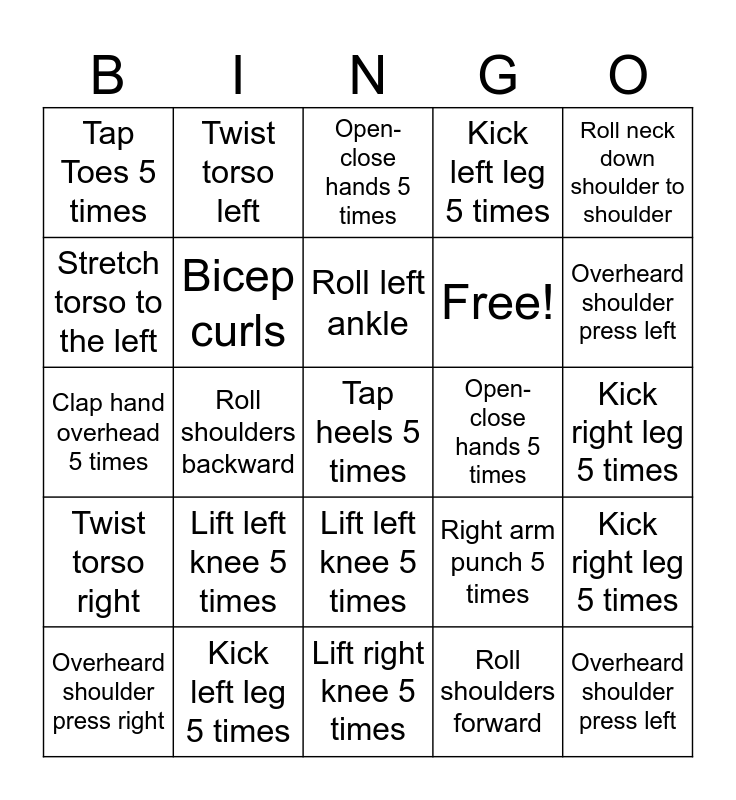 This bingo card has a free space and 47 words: Tap Toes 5 times, Overheard shoulder press left, Overheard shoulder press right, Lift right knee 5 times, Lift left knee 5 times, Twist torso right, Twist torso left, Write your name is the air, Stretch torso to the left, Stretch torso to the right, Bicep curls, Kick left leg 5 times, Kick right leg 5 times, Right arm punch 5 times, Left arm punch 5 times, Roll right ankle, Roll left ankle, Open-close hands 5 times, Clap hand overhead 5 times, Roll neck down shoulder to shoulder, Roll shoulders backward, Roll shoulders forward, Tap Toes 5 times, Free!, Make a funny face, Overheard shoulder press left, Overheard shoulder press right, Lift right knee 5 times, Lift left knee 5 times, Twist torso right, Twist torso left, Write your name is the air, Stretch torso to the left, Stretch torso to the right, Bicep curls, Kick left leg 5 times, Kick right leg 5 times, Right arm punch 5 times, Left arm punch 5 times, Roll right ankle and say your name backward, Roll left ankle and say your name backward, Open-close hands 5 times, Clap hand overhead 5 times, Roll neck down shoulder to shoulder, Roll shoulders backward, Roll shoulders forward and March in place.