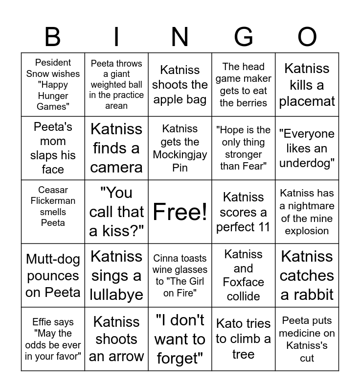 This bingo card has a free space and 24 words: Katniss sings a lullabye, Katniss shoots an arrow, Katniss gets the Mockingjay Pin, Effie says "May the odds be ever in your favor", Katniss kills a placemat, Pesident Snow wishes "Happy Hunger Games", Peeta's mom slaps his face, Peeta throws a giant weighted ball in the practice arean, Katniss scores a perfect 11, Cinna toasts wine glasses to "The Girl on Fire", "Hope is the only thing stronger than Fear", Ceasar Flickerman smells Peeta, Katniss and Foxface collide, Katniss catches a rabbit, Katniss finds a camera, Kato tries to climb a tree, Katniss has a nightmare of the mine explosion, Katniss shoots the apple bag, "Everyone likes an underdog", "You call that a kiss?", Peeta puts medicine on Katniss's cut, Mutt-dog pounces on Peeta, The head game maker gets to eat the berries and "I don't want to forget".