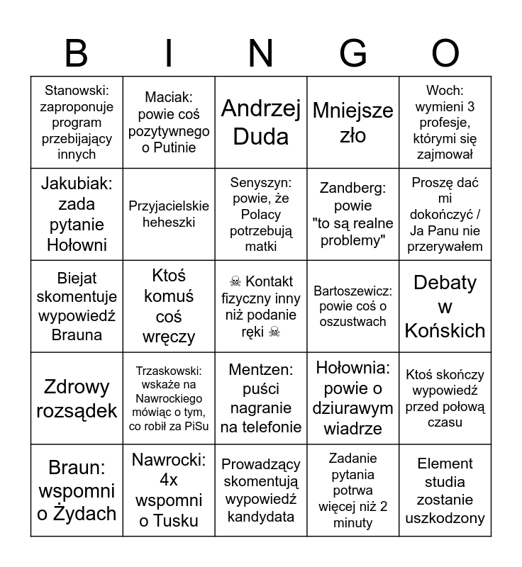This bingo card has a free space and 24 words: Trzaskowski: wskaże na Nawrockiego mówiąc o tym, co robił za PiSu, Nawrocki: 4x wspomni o Tusku, Senyszyn: powie, że Polacy potrzebują matki, Braun: wspomni o Żydach, Woch: wymieni 3 profesje, którymi się zajmował, Stanowski: zaproponuje program przebijający innych, Jakubiak: zada pytanie Hołowni, Maciak: powie coś pozytywnego o Putinie, Bartoszewicz: powie coś o oszustwach, Mentzen: puści nagranie na telefonie, Zandberg: powie "to są realne problemy", Biejat skomentuje wypowiedź Brauna, Hołownia: powie o dziurawym wiadrze, Ktoś skończy wypowiedź przed połową czasu, Przyjacielskie heheszki, Zadanie pytania potrwa więcej niż 2 minuty, Debaty w Końskich, Andrzej Duda, Proszę dać mi dokończyć / Ja Panu nie przerywałem, Ktoś komuś coś wręczy, Element studia zostanie uszkodzony, Zdrowy rozsądek, Mniejsze zło and Prowadzący skomentują wypowiedź kandydata.